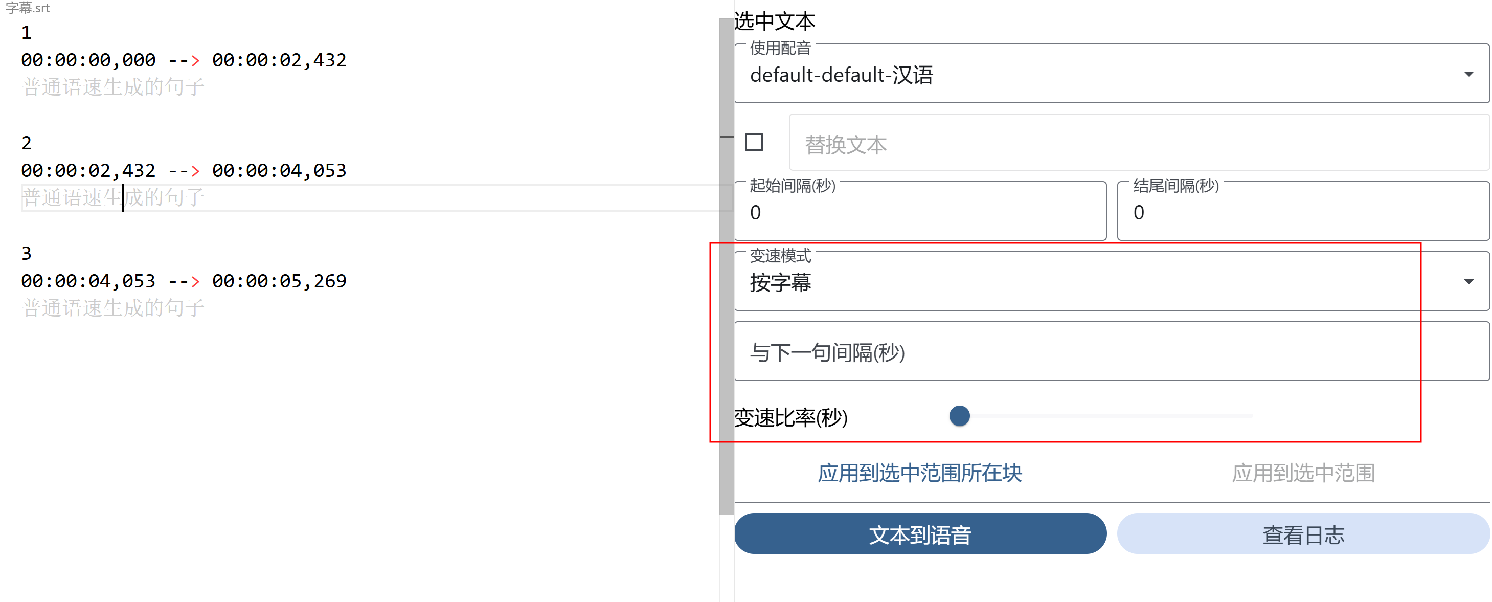这个是按照字幕的时间.最大速率是3倍…也就是说如果生成10秒的音频,但是字幕长度是5秒,那么就会自动调整(2倍)