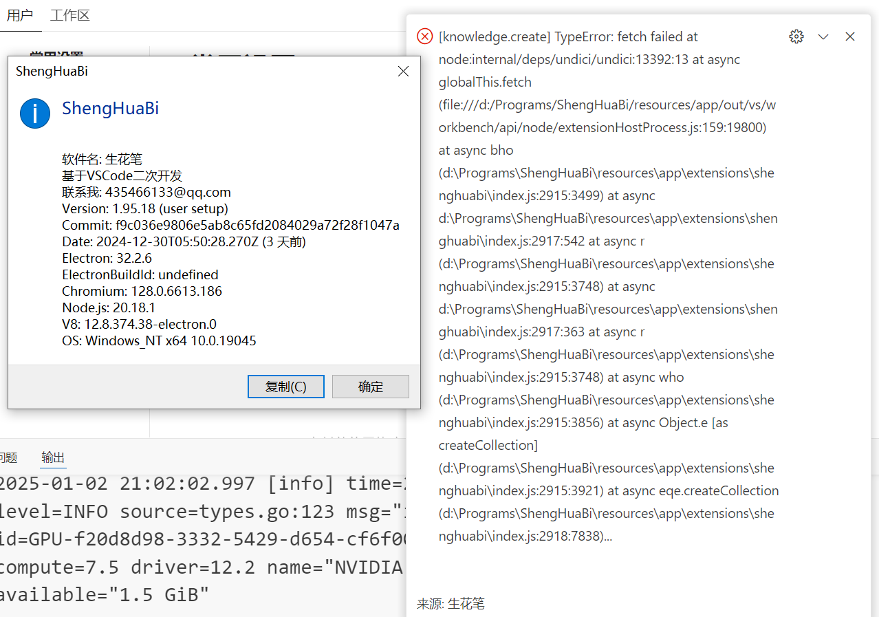 [knowledge.create] TypeError: fetch failed at node:internal/deps/undici/undici:13392:13 at async globalThis.fetch (file:///d:/Programs/ShengHuaBi/resources/app/out/vs/workbench/api/node/extensionHostProcess.js:159:19800) at async bho (d:\Programs\ShengHuaBi\resources\app\extensions\shenghuabi\index.js:2915:3499) at async d:\Programs\ShengHuaBi\resources\app\extensions\shenghuabi\index.js:2917:542 at async r (d:\Programs\ShengHuaBi\resources\app\extensions\shenghuabi\index.js:2915:3748) at async d:\Programs\ShengHuaBi\resources\app\extensions\shenghuabi\index.js:2917:363 at async r (d:\Programs\ShengHuaBi\resources\app\extensions\shenghuabi\index.js:2915:3748) at async who (d:\Programs\ShengHuaBi\resources\app\extensions\shenghuabi\index.js:2915:3856) at async Object.e [as createCollection] (d:\Programs\ShengHuaBi\resources\app\extensions\shenghuabi\index.js:2915:3921) at async eqe.createCollection (d:\Programs\ShengHuaBi\resources\app\extensions\shenghuabi\index.js:2918:7838)...