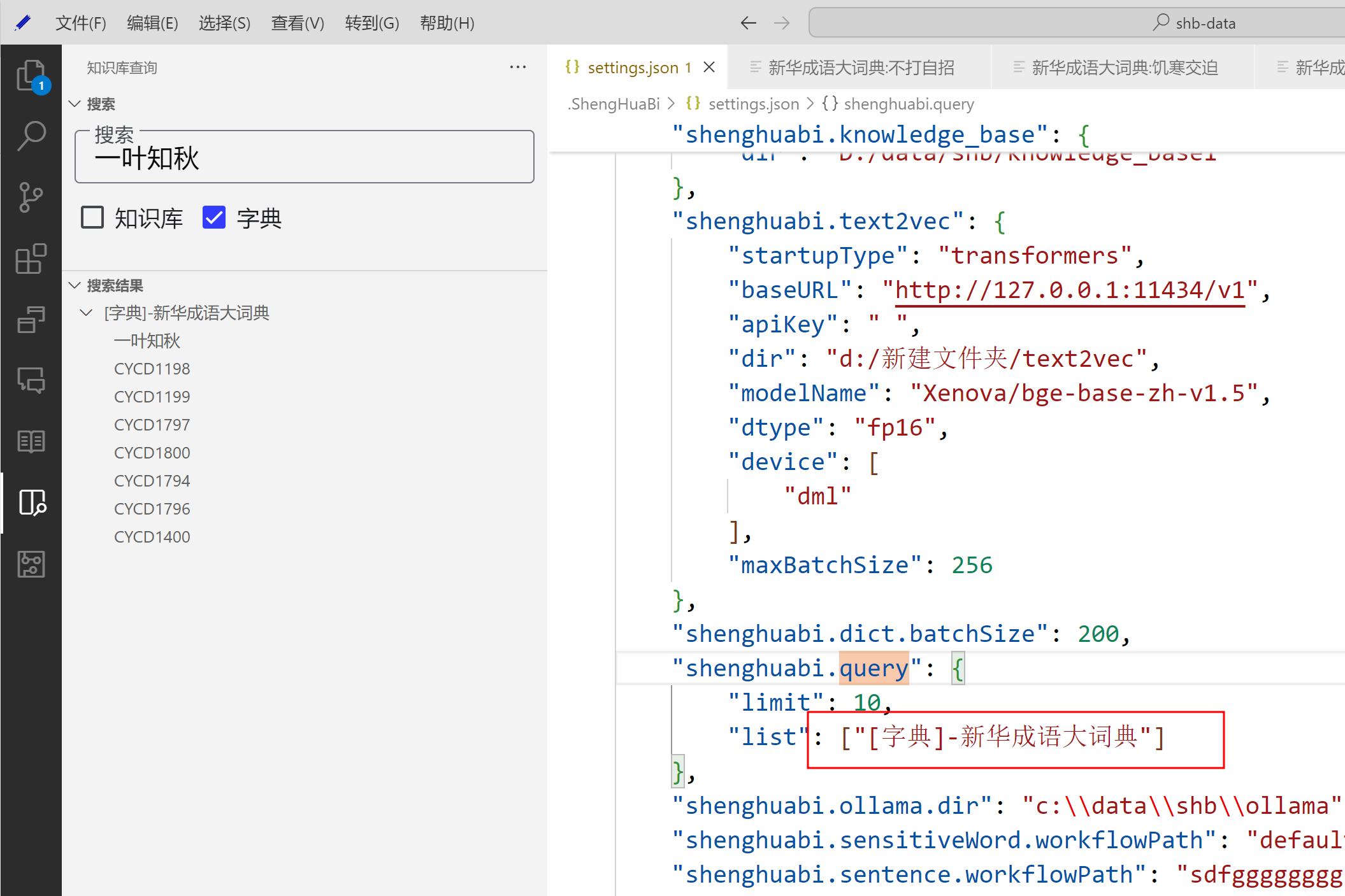 2025-01-03 19:40:43.253 [info] 知识库配置:{"name":"ttt","type":"knowledge","graphIndex":false,"collectionList":[{"embedding":{"type":"transformers","model":"Xenova/bge-base-zh-v1.5","size":768,"baseURL":"http://127.0.0.1:11434/v1","dtype":"q8","device":"cpu"},"chunkSize":100,"collectionName":"ttt","embeddingTemplate":{"entry":{"value":"","enable":false}}}],"activateCollection":"ttt","embedding":{"type":"transformers","model":"Xenova/bge-base-zh-v1.5","size":768,"baseURL":"http://127.0.0.1:11434/v1","dtype":"q8","device":"cpu"},"chunkSize":100,"collectionName":"ttt","embeddingTemplate":{"entry":{"value":"","enable":false}}}